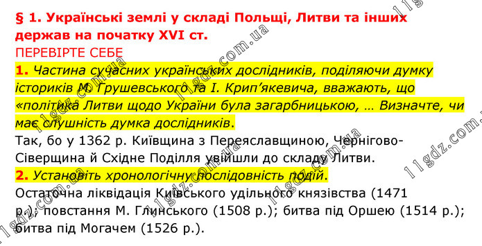 § 1. Українські землі у складі Польщі, Литви та інших держав на початку XVI ст. ПЕРЕВІРТЕ СЕБЕ 1. Частина сучасних українських дослідників, поділяючи думку істориків М. Грушевського та І. Крип’якевича, вважають, що «політика Литви щодо України була загарбницькою, … Визначте, чи має слушність думка дослідників. Так, бо у 1362 р. Київщина з Переяславщиною, Чернігово-Сіверщина й Східне Поділля увійшли до складу Литви. 2. Установіть хронологічну послідовність подій. Остаточна ліквідація Київського удільного князівства (1471 р.); повстання М. Глинського (1508 р.); битва під Оршею (1514 р.); битва під Могачем (1526 р.).