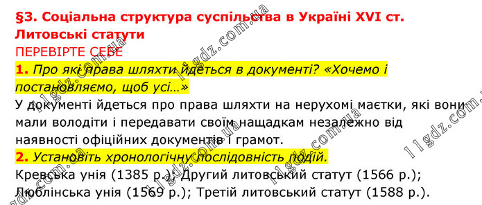 §3. Соціальна структура суспільства в Україні XVI ст. Литовські статути ПЕРЕВІРТЕ СЕБЕ 1. Про які права шляхти йдеться в документі? «Хочемо і постановляємо, щоб усі…» У документі йдеться про права шляхти на нерухомі маєтки, які вони мали володіти і передавати своїм нащадкам незалежно від наявності офіційних документів і грамот. 2. Установіть хронологічну послідовність подій. Кревська унія (1385 р.); Другий литовський статут (1566 р.); Люблінська унія (1569 р.); Третій литовський статут (1588 р.).