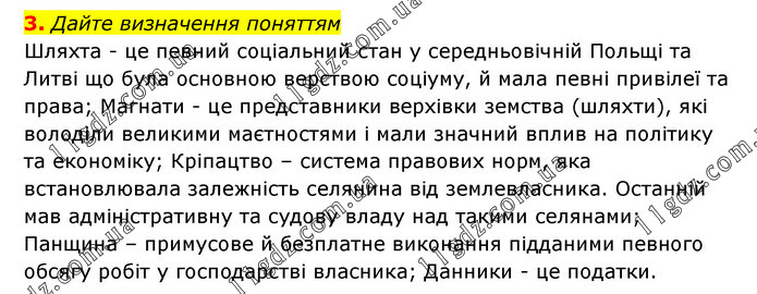 3. Дайте визначення поняттям Шляхта - це певний соціальний стан у середньовічній Польщі та Литві що була основною верствою соціуму, й мала певні привілеї та права; Магнати - це представники верхівки земства (шляхти), які володіли великими маєтностями і мали значний вплив на політику та економіку; Кріпацтво – система правових норм, яка встановлювала залежність селянина від землевласника. Останній мав адміністративну та судову владу над такими селянами; Панщина – примусове й безплатне виконання підданими певного обсягу робіт у господарстві власника; Данники - це податки.