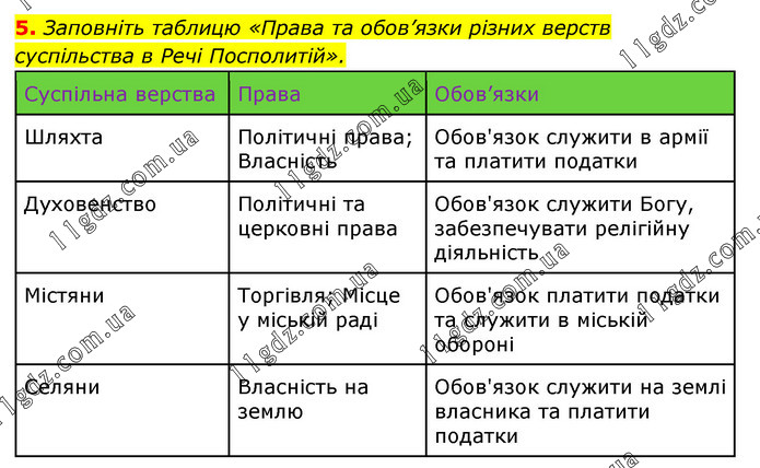 Заповніть таблицю «Права та обов’язки різних верств суспільства в Речі Посполитій». Суспільна верства Права Обов’язки Шляхта Політичні права; Власність Обов'язок служити в армії та платити податки Духовенство Політичні та церковні права Обов'язок служити Богу, забезпечувати релігійну діяльність Містяни Торгівля; Місце у міській раді Обов'язок платити податки та служити в міській обороні Селяни Власність на землю Обов'язок служити на землі власника та платити податки
