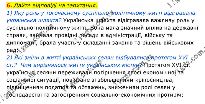 6. Дайте відповіді на запитання. 1) Яку роль у тогочасному суспільно-політичному житті відігравала українська шляхта? Українська шляхта відігравала важливу роль у суспільно-політичному житті. Вона мала значний вплив на державні справи, займала провідні посади в адміністрації, війську та дипломатії, брала участь у складанні законів та рішень військових рад; 2) Які зміни в житті українських селян відбувалися протягом XVI ст.? Чим вирізнялося життя українських містян? Протягом XVI ст. українські селяни переживали погіршення своєї економічної та соціальної ситуації, пов'язане зі збільшенням кріпосництва, підвищенням податків та обтяжень, зниженням ролі селян у господарстві та загостренням соціально-економічних протиріч;