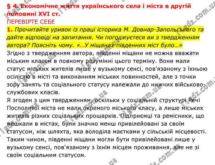 § 4. Економічне життя українського села і міста в другій половині XVI ст. ПЕРЕВІРТЕ СЕБЕ 1. Прочитайте уривок із праці історика М. Довнар-Запольського та дайте відповіді на запитання. Чи погоджуєтеся ви з твердженням автора? Поясніть чому. «…У міщанах південних міст було…» Згідно з твердженням автора, південні міщани не можна вважати міським класом в повному розумінні цього терміну. Вони мали статус міських жителів лише у вузькому сенсі, пов'язаному з їхньою осілістю в місті та виконанням міських повинностей, але з точки зору занять та соціального статусу належали до нижчих військово-службових класів. Я згоден з цим твердженням, оскільки у соціальній структурі Речі Посполитої міста не мали окремого міського класу, а лише міських жителів різних соціальних прошарків. Підприємці та ремісники, що мешкали в містах, були значно менш привілейовані за своїм статусом, ніж шляхта, яка володіла маєтками у сільській місцевості. Таким чином, південні міщани могли бути привілейовані лише у вузькому сенсі, пов'язаному з їхнім місцем проживання, але не зі своїм соціальним статусом.