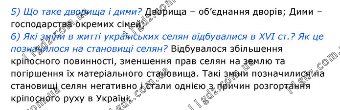 5) Що таке дворища і дими? Дворища – об’єднання дворів; Дими – господарства окремих сімей; 6) Які зміни в житті українських селян відбувалися в XVI ст.? Як це позначилося на становищі селян? Відбувалося збільшення кріпосного повинності, зменшення прав селян на землю та погіршення їх матеріального становища. Такі зміни позначилися на становищі селян негативно і стали однією з причин розгортання кріпосного руху в Україні.