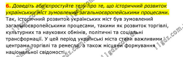 6. Доведіть або спростуйте тезу про те, що історичний розвиток українських міст зумовлений загальноєвропейськими процесами. Так, історичний розвиток українських міст був зумовлений загальноєвропейськими процесами, такими як розвиток торгівлі, культурних та наукових обмінів, політичні та соціальні трансформації. У цей період українські міста стали важливими центрами торгівлі та ремесла, а також місцями формування національної свідомості.