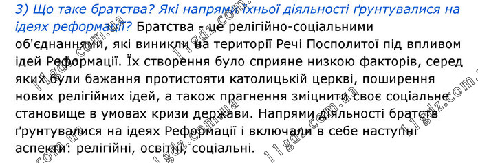 3) Що таке братства? Які напрями їхньої діяльності ґрунтувалися на ідеях реформації? Братства - це релігійно-соціальними об'єднаннями, які виникли на території Речі Посполитої під впливом ідей Реформації. Їх створення було сприяне низкою факторів, серед яких були бажання протистояти католицькій церкві, поширення нових релігійних ідей, а також прагнення зміцнити своє соціальне становище в умовах кризи держави. Напрями діяльності братств ґрунтувалися на ідеях Реформації і включали в себе наступні аспекти: релігійні, освітні, соціальні.