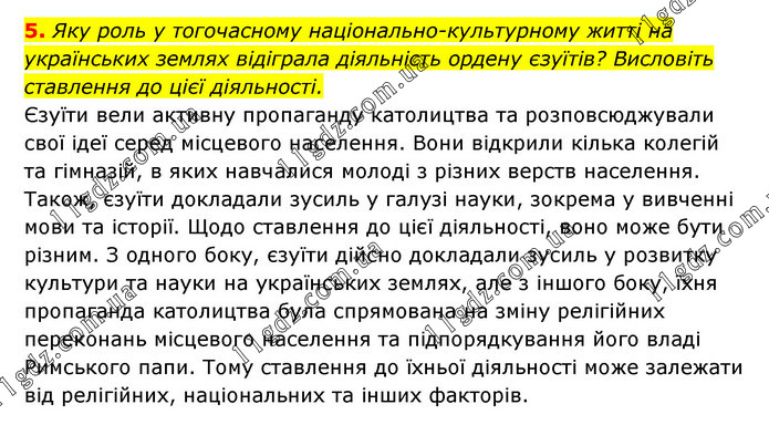5. Яку роль у тогочасному національно-культурному житті на українських землях відіграла діяльність ордену єзуїтів? Висловіть ставлення до цієї діяльності. Єзуїти вели активну пропаганду католицтва та розповсюджували свої ідеї серед місцевого населення. Вони відкрили кілька колегій та гімназій, в яких навчалися молоді з різних верств населення. Також, єзуїти докладали зусиль у галузі науки, зокрема у вивченні мови та історії. Щодо ставлення до цієї діяльності, воно може бути різним. З одного боку, єзуїти дійсно докладали зусиль у розвитку культури та науки на українських землях, але з іншого боку, їхня пропаганда католицтва була спрямована на зміну релігійних переконань місцевого населення та підпорядкування його владі Римського папи. Тому ставлення до їхньої діяльності може залежати від релігійних, національних та інших факторів.