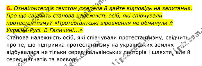 6. Ознайомтеся з текстом джерела й дайте відповідь на запитання. Про що свідчить станова належність осіб, які співчували протестантизму? «Протестантські віровчення не обминули й України-Русі. В Галичині...» Станова належність осіб, які співчували протестантизму, свідчить про те, що підтримка протестантизму на українських землях відбувалася не тільки серед кальвінських пасторів і шляхти, але й серед магнатів та воєвод.
