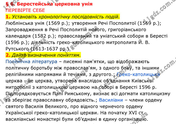 § 6. Берестейська церковна унія ПЕРЕВІРТЕ СЕБЕ 1. Установіть хронологічну послідовність подій. Люблінська унія (1569 р.); утворення Речі Посполитої (1569 р.); Запровадження в Речі Посполитій нового, григоріанського календаря (1582 р.); православний та уніатський собори в Бересті (1596 р.); діяльність греко-католицького митрополита Й. В. Рутського (1613-1637 рр.) 2. Дайте визначення поняттям. Полемічна література – писемні пам'ятки, що відображають політичну боротьбу між православ'ям, з одного боку, та іншими релігійними напрямами й течіями, з другого.; Греко-католицька церква - це церква, утворена внаслідок об’єднання Київської митрополії з католицькою церквою на соборі в Бересті 1596 р. Підпорядковується Папі Римському, визнає всі догмати католицизму та зберігає православну обрядовість.; Василіани – члени ордену святого Василія Великого, про відного чернечого ордену Української греко-католицької церкви. На початку XVI ст. василіанські монастирі були об’єднані в єдину організацію.
