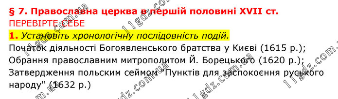 § 7. Православна церква в першій половині XVII ст. ПЕРЕВІРТЕ СЕБЕ 1. Установіть хронологічну послідовність подій. Початок діяльності Богоявленського братства у Києві (1615 р.); Обрання православним митрополитом Й. Борецького (1620 р.); Затвердження польским сеймом "Пунктів для заспокоєння руського народу" (1632 р.)