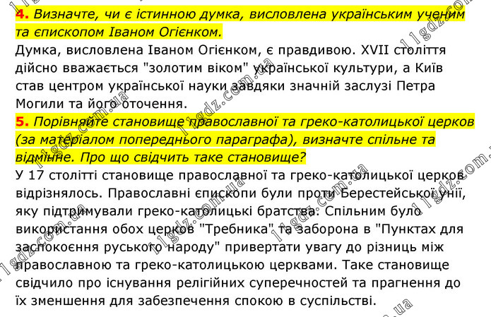 4. Визначте, чи є істинною думка, висловлена українським ученим та єпископом Іваном Огієнком. Думка, висловлена Іваном Огієнком, є правдивою. XVII століття дійсно вважається "золотим віком" української культури, а Київ став центром української науки завдяки значній заслузі Петра Могили та його оточення. 5. Порівняйте становище православної та греко-католицької церков (за матеріалом попереднього параграфа), визначте спільне та відмінне. Про що свідчить таке становище? У 17 столітті становище православної та греко-католицької церков відрізнялось. Православні єпископи були проти Берестейської унії, яку підтримували греко-католицькі братства. Спільним було використання обох церков "Требника" та заборона в "Пунктах для заспокоєння руського народу" привертати увагу до різниць між православною та греко-католицькою церквами. Таке становище свідчило про існування релігійних суперечностей та прагнення до їх зменшення для забезпечення спокою в суспільстві.