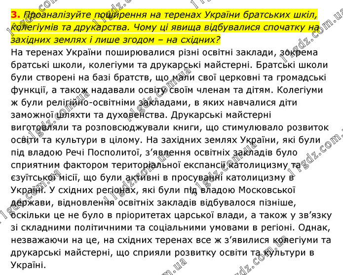 Проаналізуйте поширення на теренах України братських шкіл, колегіумів та друкарства. Чому ці явища відбувалися спочатку на західних землях і лише згодом – на східних? На теренах України поширювалися різні освітні заклади, зокрема братські школи, колегіуми та друкарські майстерні. Братські школи були створені на базі братств, що мали свої церковні та громадські функції, а також надавали освіту своїм членам та дітям. Колегіуми ж були релігійно-освітніми закладами, в яких навчалися діти заможної шляхти та духовенства. Друкарські майстерні виготовляли та розповсюджували книги, що стимулювало розвиток освіти та культури в цілому. На західних землях України, які були під владою Речі Посполитої, з’явлення освітніх закладів було сприятним фактором територіальної експансії католицизму та єзуїтської місії, що були активні в просуванні католицизму в Україні. У східних регіонах, які були під владою Московської держави, відновлення освітніх закладів відбувалося пізніше, оскільки це не було в пріоритетах царської влади, а також у зв’язку зі складними політичними та соціальними умовами в регіоні. Однак, незважаючи на це, на східних теренах все ж з’явилися колегіуми та друкарські майстерні, що сприяли розвитку освіти та культури в Україні.