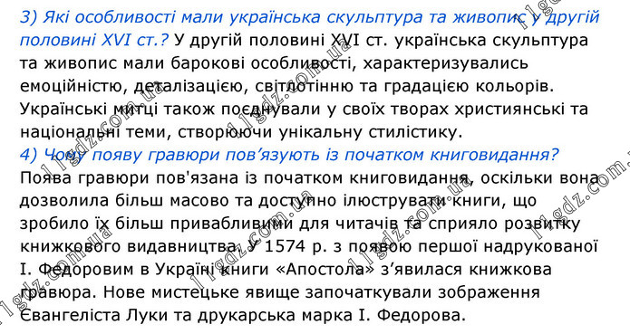 3) Які особливості мали українська скульптура та живопис у другій половині XVI ст.? У другій половині XVI ст. українська скульптура та живопис мали барокові особливості, характеризувались емоційністю, деталізацією, світлотінню та градацією кольорів. Українські митці також поєднували у своїх творах християнські та національні теми, створюючи унікальну стилістику. 4) Чому появу гравюри пов’язують із початком книговидання? Поява гравюри пов'язана із початком книговидання, оскільки вона дозволила більш масово та доступно ілюструвати книги, що зробило їх більш привабливими для читачів та сприяло розвитку книжкового видавництва. У 1574 р. з появою першої надрукованої І. Федоровим в Україні книги «Апостола» з’явилася книжкова гравюра. Нове мистецьке явище започаткували зображення Євангеліста Луки та друкарська марка І. Федорова.