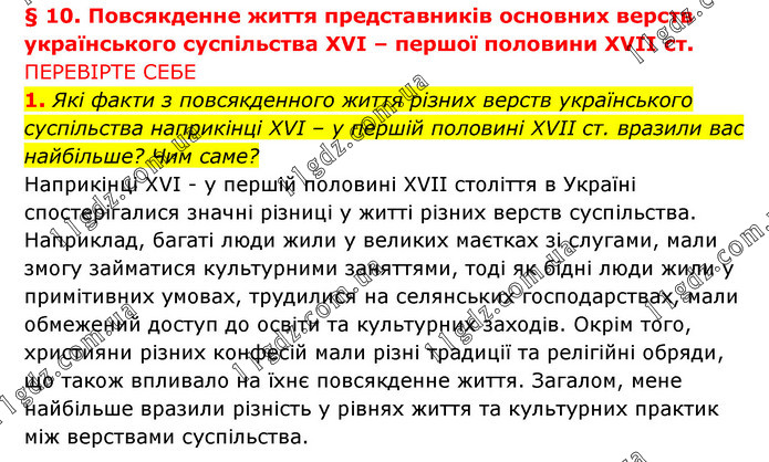 § 10. Повсякденне життя представників основних верств українського суспільства XVI – першої половини XVII ст. ПЕРЕВІРТЕ СЕБЕ 1. Які факти з повсякденного життя різних верств українського суспільства наприкінці XVI – у першій половині XVII ст. вразили вас найбільше? Чим саме? Наприкінці XVI - у першій половині XVII століття в Україні спостерігалися значні різниці у житті різних верств суспільства. Наприклад, багаті люди жили у великих маєтках зі слугами, мали змогу займатися культурними заняттями, тоді як бідні люди жили у примітивних умовах, трудилися на селянських господарствах, мали обмежений доступ до освіти та культурних заходів. Окрім того, християни різних конфесій мали різні традиції та релігійні обряди, що також впливало на їхнє повсякденне життя. Загалом, мене найбільше вразили різність у рівнях життя та культурних практик між верствами суспільства.