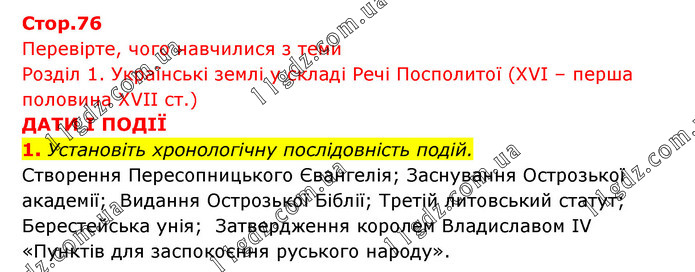 Перевірте, чого навчилися з теми Розділ 1. Українські землі у складі Речі Посполитої (XVI – перша половина XVII ст.) ДАТИ І ПОДІЇ 1. Установіть хронологічну послідовність подій. Створення Пересопницького Євангелія; Заснування Острозької академії; Видання Острозької Біблії; Третій литовський статут; Берестейська унія; Затвердження королем Владиславом IV «Пунктів для заспокоєння руського народу».