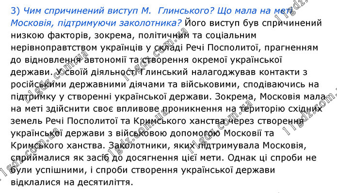 3) Чим спричинений виступ М. Глинського? Що мала на меті Московія, підтримуючи заколотника? Його виступ був спричинений низкою факторів, зокрема, політичним та соціальним нерівноправтством українців у складі Речі Посполитої, прагненням до відновлення автономії та створення окремої української держави. У своїй діяльності Глинський налагоджував контакти з російськими державними діячами та військовими, сподіваючись на підтримку у створенні української держави. Зокрема, Московія мала на меті здійснити своє впливове проникнення на територію східних земель Речі Посполитої та Кримського ханства через створення української держави з військовою допомогою Московії та Кримського ханства. Заколотники, яких підтримувала Московія, сприймалися як засіб до досягнення цієї мети. Однак ці спроби не були успішними, і спроби створення української держави відклалися на десятиліття.
