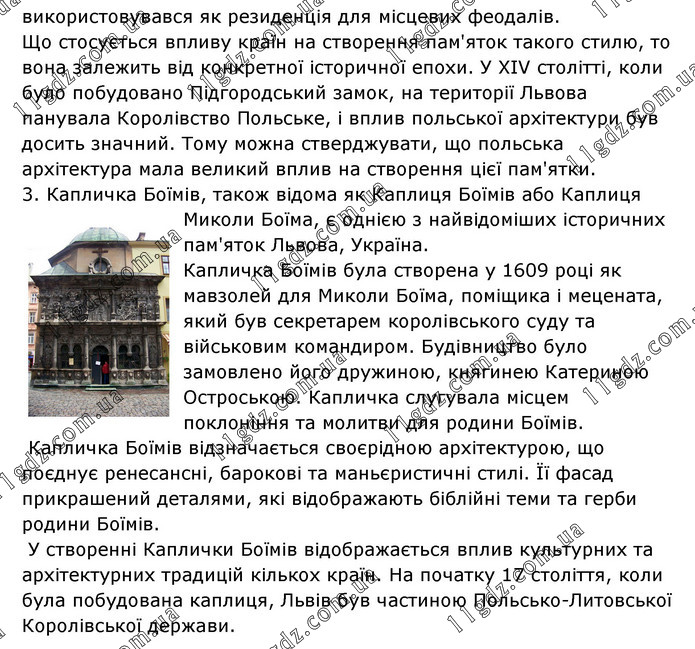 використовувався як резиденція для місцевих феодалів. Що стосується впливу країн на створення пам'яток такого стилю, то вона залежить від конкретної історичної епохи. У XIV столітті, коли було побудовано Підгородський замок, на території Львова панувала Королівство Польське, і вплив польської архітектури був досить значний. Тому можна стверджувати, що польська архітектура мала великий вплив на створення цієї пам'ятки. 3. Капличка Боїмів, також відома як Каплиця Боїмів або Каплиця Миколи Боїма, є однією з найвідоміших історичних пам'яток Львова, Україна. Капличка Боїмів була створена у 1609 році як мавзолей для Миколи Боїма, поміщика і мецената, який був секретарем королівського суду та військовим командиром. Будівництво було замовлено його дружиною, княгинею Катериною Остроською. Капличка слугувала місцем поклоніння та молитви для родини Боїмів. Капличка Боїмів відзначається своєрідною архітектурою, що поєднує ренесансні, барокові та маньєристичні стилі. Її фасад прикрашений деталями, які відображають біблійні теми та герби родини Боїмів. У створенні Каплички Боїмів відображається вплив культурних та архітектурних традицій кількох країн. На початку 17 століття, коли була побудована каплиця, Львів був частиною Польсько-Литовської Королівської держави.