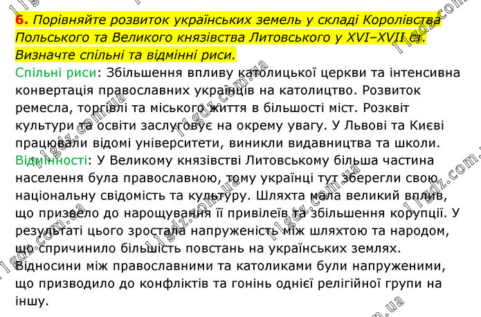 6. Порівняйте розвиток українських земель у складі Королівства Польського та Великого князівства Литовського у XVI–XVII ст. Визначте спільні та відмінні риси. Спільні риси: Збільшення впливу католицької церкви та інтенсивна конвертація православних українців на католицтво. Розвиток ремесла, торгівлі та міського життя в більшості міст. Розквіт культури та освіти заслуговує на окрему увагу. У Львові та Києві працювали відомі університети, виникли видавництва та школи. Відмінності: У Великому князівстві Литовському більша частина населення була православною, тому українці тут зберегли свою національну свідомість та культуру. Шляхта мала великий вплив, що призвело до нарощування її привілеїв та збільшення корупції. У результаті цього зростала напруженість між шляхтою та народом, що спричинило більшість повстань на українських землях. Відносини між православними та католиками були напруженими, що призводило до конфліктів та гонінь однієї релігійної групи на іншу.