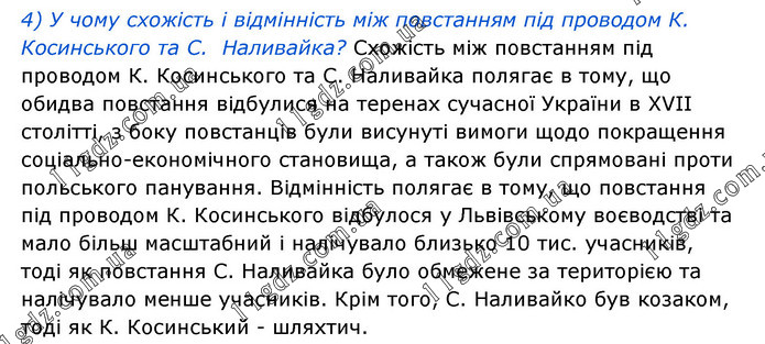 4) У чому схожість і відмінність між повстанням під проводом К. Косинського та С. Наливайка? Схожість між повстанням під проводом К. Косинського та С. Наливайка полягає в тому, що обидва повстання відбулися на теренах сучасної України в XVII столітті, з боку повстанців були висунуті вимоги щодо покращення соціально-економічного становища, а також були спрямовані проти польського панування. Відмінність полягає в тому, що повстання під проводом К. Косинського відбулося у Львівському воєводстві та мало більш масштабний і налічувало близько 10 тис. учасників, тоді як повстання С. Наливайка було обмежене за територією та налічувало менше учасників. Крім того, С. Наливайко був козаком, тоді як К. Косинський - шляхтич.