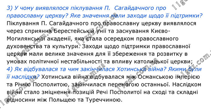 3) У чому виявлялося піклування П. Сагайдачного про православну церкву? Яке значення мали заходи щодо її підтримки? Піклування П. Сагайдачного про православну церкву виявлялося через сприяння Берестейській унії та заснування Києво-Могилянської академії, яка стала осередком православного духовенства та культури. Заходи щодо підтримки православної церкви мали велике значення для її збереження та розвитку в умовах політичної нестабільності та впливу католицької церкви; 4) Як відбувалася та чим закінчилася Хотинська війна? Якими були її наслідки? Хотинська війна відбувалася між Османською імперією та Річчю Посполитою, закінчилася перемогою останньої. Наслідком війни стало зміцнення позицій Речі Посполитої на сході та складні відносини між Польщею та Туреччиною.