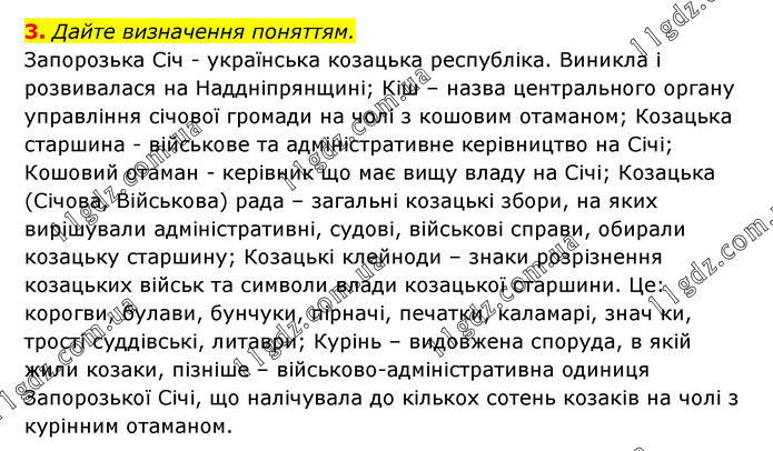 Дайте визначення поняттям. Запорозька Січ - українська козацька республіка. Виникла і розвивалася на Наддніпрянщині; Кіш – назва центрального органу управління січової громади на чолі з кошовим отаманом; Козацька старшина - військове та адміністративне керівництво на Січі; Кошовий отаман - керівник що має вищу владу на Січі; Козацька (Січова, Військова) рада – загальні козацькі збори, на яких вирішували адміністративні, судові, військові справи, обирали козацьку старшину; Козацькі клейноди – знаки розрізнення козацьких військ та символи влади козацької старшини. Це: корогви, булави, бунчуки, пірначі, печатки, каламарі, знач ки, трості суддівські, литаври; Курінь – видовжена споруда, в якій жили козаки, пізніше – військово-адміністративна одиниця Запорозької Січі, що налічувала до кількох сотень козаків на чолі з курінним отаманом.
