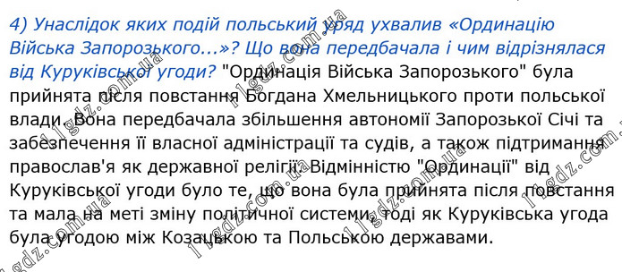 4) Унаслідок яких подій польський уряд ухвалив «Ординацію Війська Запорозького...»? Що вона передбачала і чим відрізнялася від Куруківської угоди? "Ординація Війська Запорозького" була прийнята після повстання Богдана Хмельницького проти польської влади. Вона передбачала збільшення автономії Запорозької Січі та забезпечення її власної адміністрації та судів, а також підтримання православ'я як державної релігії. Відмінністю "Ординації" від Куруківської угоди було те, що вона була прийнята після повстання та мала на меті зміну політичної системи, тоді як Куруківська угода була угодою між Козацькою та Польською державами.