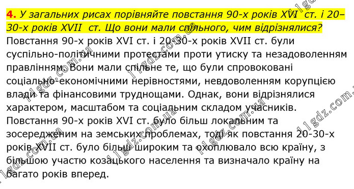 У загальних рисах порівняйте повстання 90-х років XVI ст. і 20–30-х років XVII ст. Що вони мали спільного, чим відрізнялися? Повстання 90-х років XVI ст. і 20-30-х років XVII ст. були суспільно-політичними протестами проти утиску та незадоволенням правлінням. Вони мали спільне те, що були спровоковані соціально-економічними нерівностями, невдоволенням корупцією влади та фінансовими труднощами. Однак, вони відрізнялися характером, масштабом та соціальним складом учасників. Повстання 90-х років XVI ст. було більш локальним та зосередженим на земських проблемах, тоді як повстання 20-30-х років XVII ст. було більш широким та охоплювало всю країну, з більшою участю козацького населення та визначало країну на багато років вперед.