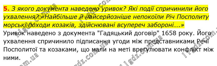 З якого документа наведено уривок? Які події спричинили його ухвалення? «Найбільше й найсерйозніше непокоїли Річ Посполиту морські походи козаків, здійснювані всупереч забороні….» Уривок наведено з документа "Гадяцький договір" 1658 року. Його ухвалення спричинило підписання угоди між представниками Речі Посполитої та козаками, що мали на меті врегулювати конфлікт між ними.