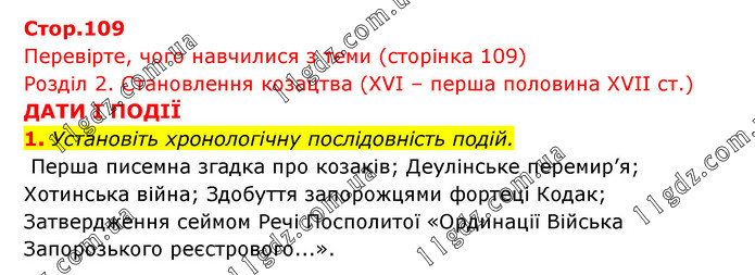 Перевірте, чого навчилися з теми (сторінка 109) Розділ 2. Становлення козацтва (ХVІ – перша половина ХVІІ ст.) ДАТИ І ПОДІЇ 1. Установіть хронологічну послідовність подій. Перша писемна згадка про козаків; Деулінське перемир’я; Хотинська війна; Здобуття запорожцями фортеці Кодак; Затвердження сеймом Речі Посполитої «Ординації Війська Запорозького реєстрового...».