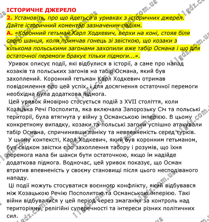 ІСТОРИЧНЕ ДЖЕРЕЛО 2. Установіть, про що йдеться в уривках з історичних джерел. Дайте історичний коментар зазначеним подіям. А. «Коронний гетьман Карл Ходкевич, верхи на коні, стояв біля свого шанця, коли примчав гонець зі звісткою, що козаки з кількома польськими загонами захопили вже табір Османа і що для остаточної перемоги бракує тільки підмоги...». Уривок описує події, які відбулися в історії, а саме про напад козаків та польських загонів на табір Османа, який був захоплений. Коронний гетьман Карл Ходкевич отримав повідомлення про цей успіх, і для досягнення остаточної перемоги необхідна була додаткова підмога. Цей уривок ймовірно стосується подій з XVII століття, коли Козацька Речі Посполита, яка включала Запорозьку Січ та польські території, була втягнута у війну з Османською імперією. В цьому конкретному випадку, козаки та польські загони успішно атакували табір Османа, спричинивши паніку та невпевненість серед турків. У цьому контексті, Карл Ходкевич, який був коронним гетьманом, був свідком звістки про захоплення табору і розумів, що їхня перемога мала би шанси бути остаточною, якщо їм надійде додаткова підмога. Водночас, цей уривок показує, що Осман втратив впевненість у своєму становищі після цього несподіваного нападу. Ці події можуть стосуватися воєнного конфлікту, який відбувався між Козацькою Речію Посполитою та Османською імперією. Такі війни відбувалися у цей період через змагання за контроль над територіями, релігійні суперечності та інтереси різних політичних сил.