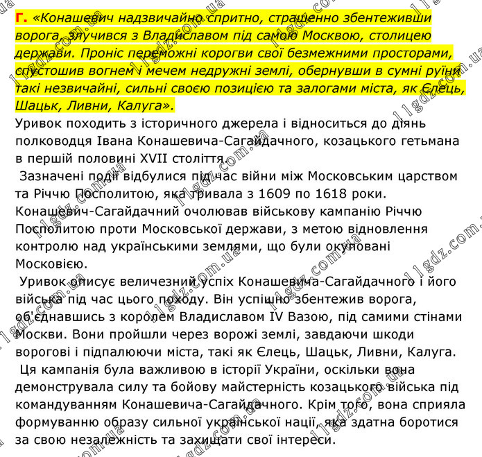 «Конашевич надзвичайно спритно, страшенно збентеживши ворога, злучився з Владиславом під самою Москвою, столицею держави. Проніс переможні корогви свої безмежними просторами, спустошив вогнем і мечем недружні землі, обернувши в сумні руїни такі незвичайні, сильні своєю позицією та залогами міста, як Єлець, Шацьк, Ливни, Калуга». Уривок походить з історичного джерела і відноситься до діянь полководця Івана Конашевича-Сагайдачного, козацького гетьмана в першій половині XVII століття. Зазначені події відбулися під час війни між Московським царством та Річчю Посполитою, яка тривала з 1609 по 1618 роки. Конашевич-Сагайдачний очолював військову кампанію Річчю Посполитою проти Московської держави, з метою відновлення контролю над українськими землями, що були окуповані Московією. Уривок описує величезний успіх Конашевича-Сагайдачного і його війська під час цього походу. Він успішно збентежив ворога, об'єднавшись з королем Владиславом IV Вазою, під самими стінами Москви. Вони пройшли через ворожі землі, завдаючи шкоди ворогові і підпалюючи міста, такі як Єлець, Шацьк, Ливни, Калуга. Ця кампанія була важливою в історії України, оскільки вона демонструвала силу та бойову майстерність козацького війська під командуванням Конашевича-Сагайдачного. Крім того, вона сприяла формуванню образу сильної української нації, яка здатна боротися за свою незалежність та захищати свої інтереси.