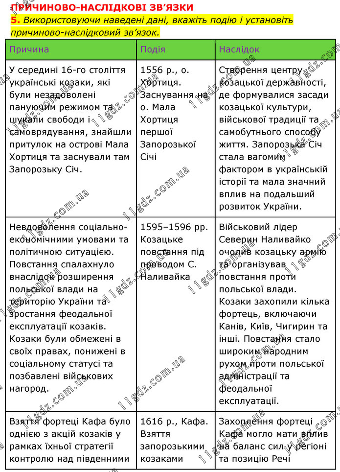 ПРИЧИНОВО-НАСЛІДКОВІ ЗВ’ЯЗКИ 5. Використовуючи наведені дані, вкажіть подію і установіть причиново-наслідковий зв’язок. Причина Подія Наслідок У середині 16-го століття українські козаки, які були незадоволені пануючим режимом та шукали свободи і самоврядування, знайшли притулок на острові Мала Хортиця та заснували там Запорозьку Січ. 1556 р., о. Хортиця. Заснування на о. Мала Хортиця першої Запорозької Січі Створення центру козацької державності, де формувалися засади козацької культури, військової традиції та самобутнього способу життя. Запорозька Січ стала вагомим фактором в українській історії та мала значний вплив на подальший розвиток України. Невдоволення соціально-економічними умовами та політичною ситуацією. Повстання спалахнуло внаслідок розширення польської влади на територію України та зростання феодальної експлуатації козаків. Козаки були обмежені в своїх правах, понижені в соціальному статусі та позбавлені військових нагород. 1595–1596 рр. Козацьке повстання під проводом С. Наливайка Військовий лідер Северин Наливайко очолив козацьку армію та організував повстання проти польської влади. Козаки захопили кілька фортець, включаючи Канів, Київ, Чигирин та інші. Повстання стало широким народним рухом проти польської адміністрації та феодальної експлуатації. Взяття фортеці Кафа було однією з акцій козаків у рамках їхньої стратегії контролю над південними кордонами Речі Посполитої. Воюючи проти Османської імперії, запорозькі козаки намагалися послабити турецький вплив у регіоні і відкрити шлях для подальших військових операцій. 1616 р., Кафа. Взяття запорозькими козаками турецької фортеці Кафа Захоплення фортеці Кафа могло мати вплив на баланс сил у регіоні та позицію Речі Посполитої в її конфліктах з Османською імперією. Такі дії козаків можуть бути сприйняті як акт військової агресії, що може викликати відповідні реакції та ескалацію конфлікту.