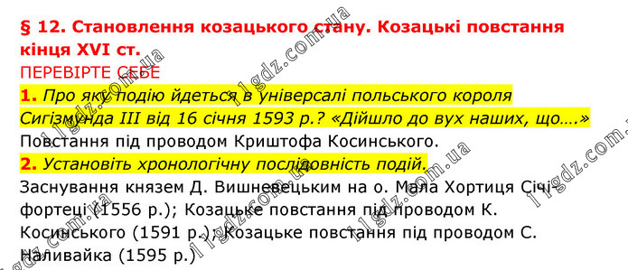 § 12. Становлення козацького стану. Козацькі повстання кінця XVI ст. ПЕРЕВІРТЕ СЕБЕ 1. Про яку подію йдеться в універсалі польського короля Сигізмунда ІІІ від 16 січня 1593 р.? «Дійшло до вух наших, що….» Повстання під проводом Криштофа Косинського. 2. Установіть хронологічну послідовність подій. Заснування князем Д. Вишневецьким на о. Мала Хортиця Січі-фортеці (1556 р.); Козацьке повстання під проводом К. Косинського (1591 р.); Козацьке повстання під проводом С. Наливайка (1595 р.)