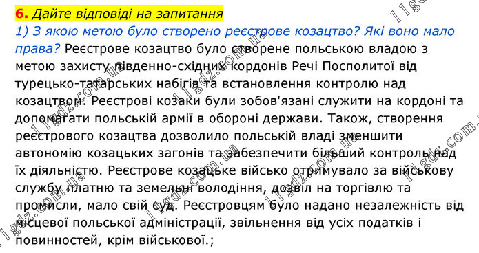 Дайте відповіді на запитання 1) З якою метою було створено реєстрове козацтво? Які воно мало права? Реєстрове козацтво було створене польською владою з метою захисту південно-східних кордонів Речі Посполитої від турецько-татарських набігів та встановлення контролю над козацтвом. Реєстрові козаки були зобов'язані служити на кордоні та допомагати польській армії в обороні держави. Також, створення реєстрового козацтва дозволило польській владі зменшити автономію козацьких загонів та забезпечити більший контроль над їх діяльністю. Реєстрове козацьке військо отримувало за військову службу платню та земельні володіння, дозвіл на торгівлю та промисли, мало свій суд. Реєстровцям було надано незалежність від місцевої польської адміністрації, звільнення від усіх податків і повинностей, крім військової.;