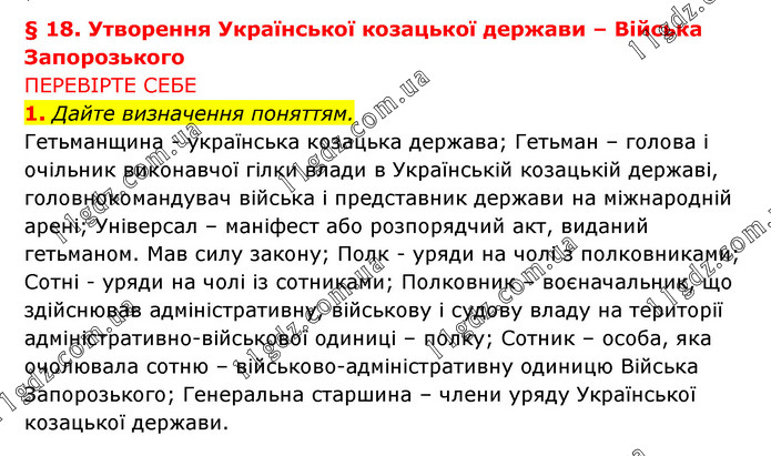 § 18. Утворення Української козацької держави – Війська Запорозького ПЕРЕВІРТЕ СЕБЕ 1. Дайте визначення поняттям. Гетьманщина - українська козацька держава; Гетьман – голова і очільник виконавчої гілки влади в Українській козацькій державі, головнокомандувач війська і представник держави на міжнародній арені; Універсал – маніфест або розпорядчий акт, виданий гетьманом. Мав силу закону; Полк - уряди на чолі з полковниками; Сотні - уряди на чолі із сотниками; Полковник – воєначальник, що здійснював адміністративну, військову і судову владу на території адміністративно-військової одиниці – полку; Сотник – особа, яка очолювала сотню – військово-адміністративну одиницю Війська Запорозького; Генеральна старшина – члени уряду Української козацької держави.