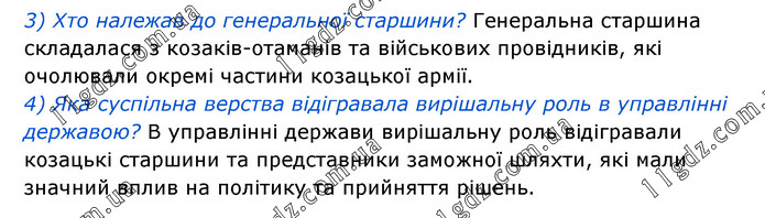 3) Хто належав до генеральної старшини? Генеральна старшина складалася з козаків-отаманів та військових провідників, які очолювали окремі частини козацької армії. 4) Яка суспільна верства відігравала вирішальну роль в управлінні державою? В управлінні держави вирішальну роль відігравали козацькі старшини та представники заможної шляхти, які мали значний вплив на політику та прийняття рішень.