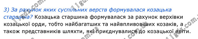 3) За рахунок яких суспільних верств формувалася козацька старшина? Козацька старшина формувалася за рахунок верхівки козацької орди, тобто найбагатших та найвпливовіших козаків, а також представників шляхти, які приєднувалися до козацької еліти.