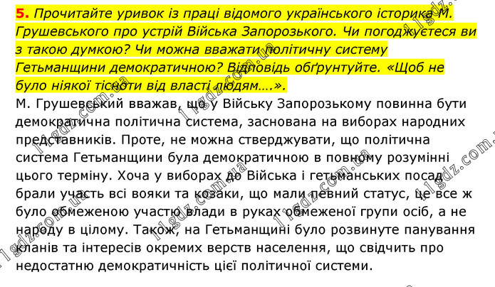 Прочитайте уривок із праці відомого українського історика М. Грушевського про устрій Війська Запорозького. Чи погоджуєтеся ви з такою думкою? Чи можна вважати політичну систему Гетьманщини демократичною? Відповідь обґрунтуйте. «Щоб не було ніякої тісноти від власті людям….». М. Грушевський вважав, що у Війську Запорозькому повинна бути демократична політична система, заснована на виборах народних представників. Проте, не можна стверджувати, що політична система Гетьманщини була демократичною в повному розумінні цього терміну. Хоча у виборах до Війська і гетьманських посад брали участь всі вояки та козаки, що мали певний статус, це все ж було обмеженою участю влади в руках обмеженої групи осіб, а не народу в цілому. Також, на Гетьманщині було розвинуте панування кланів та інтересів окремих верств населення, що свідчить про недостатню демократичність цієї політичної системи.