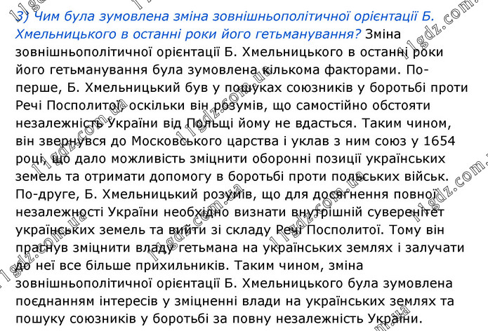 3) Чим була зумовлена зміна зовнішньополітичної орієнтації Б. Хмельницького в останні роки його гетьманування? Зміна зовнішньополітичної орієнтації Б. Хмельницького в останні роки його гетьманування була зумовлена кількома факторами. По-перше, Б. Хмельницький був у пошуках союзників у боротьбі проти Речі Посполитої, оскільки він розумів, що самостійно обстояти незалежність України від Польщі йому не вдасться. Таким чином, він звернувся до Московського царства і уклав з ним союз у 1654 році, що дало можливість зміцнити оборонні позиції українських земель та отримати допомогу в боротьбі проти польських військ. По-друге, Б. Хмельницький розумів, що для досягнення повної незалежності України необхідно визнати внутрішній суверенітет українських земель та вийти зі складу Речі Посполитої. Тому він прагнув зміцнити владу гетьмана на українських землях і залучати до неї все більше прихильників. Таким чином, зміна зовнішньополітичної орієнтації Б. Хмельницького була зумовлена поєднанням інтересів у зміцненні влади на українських землях та пошуку союзників у боротьбі за повну незалежність України.