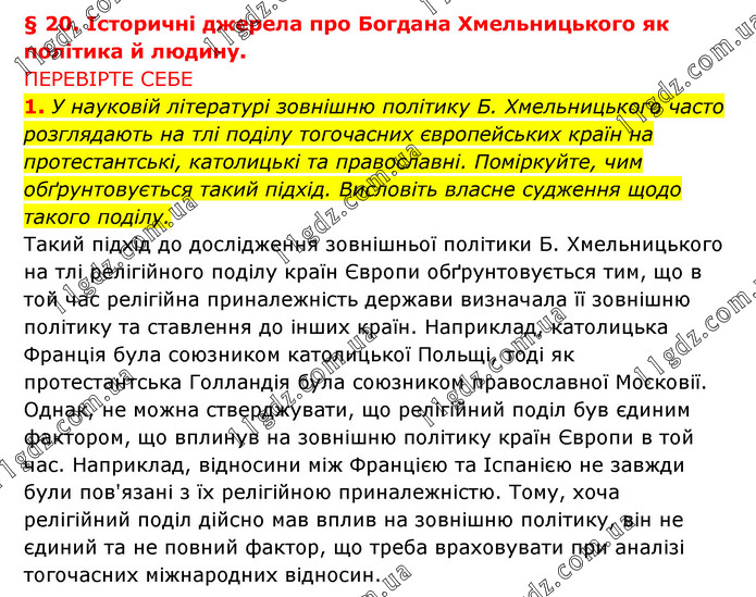 § 20. Історичні джерела про Богдана Хмельницького як політика й людину. ПЕРЕВІРТЕ СЕБЕ 1. У науковій літературі зовнішню політику Б. Хмельницького часто розглядають на тлі поділу тогочасних європейських країн на протестантські, католицькі та православні. Поміркуйте, чим обґрунтовується такий підхід. Висловіть власне судження щодо такого поділу. Такий підхід до дослідження зовнішньої політики Б. Хмельницького на тлі релігійного поділу країн Європи обґрунтовується тим, що в той час релігійна приналежність держави визначала її зовнішню політику та ставлення до інших країн. Наприклад, католицька Франція була союзником католицької Польщі, тоді як протестантська Голландія була союзником православної Московії. Однак, не можна стверджувати, що релігійний поділ був єдиним фактором, що вплинув на зовнішню політику країн Європи в той час. Наприклад, відносини між Францією та Іспанією не завжди були пов'язані з їх релігійною приналежністю. Тому, хоча релігійний поділ дійсно мав вплив на зовнішню політику, він не єдиний та не повний фактор, що треба враховувати при аналізі тогочасних міжнародних відносин.