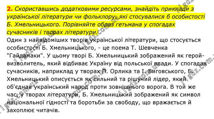 Скориставшись додатковими ресурсами, знайдіть приклади з української літератури чи фольклору, які стосувалися б особистості Б. Хмельницького. Порівняйте образ гетьмана у спогадах сучасників і творах літератури. Один з найвідоміших творів української літератури, що стосується особистості Б. Хмельницького, - це поема Т. Шевченка "Гайдамаки". У цьому творі Б. Хмельницький зображений як герой-визволитель, який відбиває Україну від польської влади. У спогадах сучасників, наприклад у творах П. Орлика та І. Виговського, Б. Хмельницький описується як сильний та рішучий лідер, який об'єднав український народ проти зовнішнього ворога. В той же час, у творах літератури, Б. Хмельницький зображений як символ національної гідності та боротьби за свободу, що вражається й захоплює читачів.