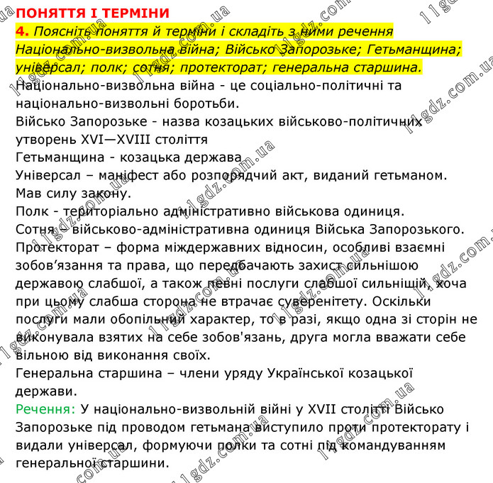 ПОНЯТТЯ І ТЕРМІНИ 4. Поясніть поняття й терміни і складіть з ними речення Національно-визвольна війна; Військо Запорозьке; Гетьманщина; універсал; полк; сотня; протекторат; генеральна старшина. Національно-визвольна війна - це соціально-політичні та національно-визвольні боротьби. Військо Запорозьке - назва козацьких військово-політичних утворень XVI—XVIII століття Гетьманщина - козацька держава Універсал – маніфест або розпорядчий акт, виданий гетьманом. Мав силу закону. Полк - територіально адміністративно військова одиниця. Сотня – військово-адміністративна одиниця Війська Запорозького. Протекторат – форма міждержавних відносин, особливі взаємні зобов’язання та права, що передбачають захист сильнішою державою слабшої, а також певні послуги слабшої сильнішій, хоча при цьому слабша сторона не втрачає суверенітету. Оскільки послуги мали обопільний характер, то в разі, якщо одна зі сторін не виконувала взятих на себе зобов'язань, друга могла вважати себе вільною від виконання своїх. Генеральна старшина – члени уряду Української козацької держави. Речення: У національно-визвольній війні у XVII столітті Військо Запорозьке під проводом гетьмана виступило проти протекторату і видали універсал, формуючи полки та сотні під командуванням генеральної старшини.