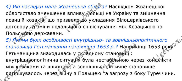 4) Які наслідки мала Жванецька облога? Наслідком Жванецької облогистало зменшення впливу Польщі на Україну та зміцнення позицій козаків, що призвело до укладання Білоцерківського договору та зміни подальшого співіснування між Козацькою та Польською державами. 5) Якими були особливості внутрішньо- та зовнішньополітичного становища Гетьманщини наприкінці 1653 р.? Наприкінці 1653 року Гетьманщина знаходилась у складному становищі: внутрішньополітична ситуація була нестабільною через конфлікти між козаками та шляхтою, а зовнішньополітичне становище погіршувалось через війну з Польщею та загрозу з боку Туреччини.