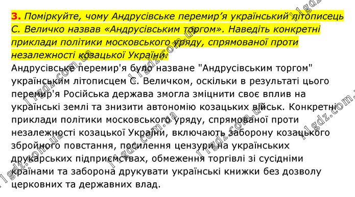 Поміркуйте, чому Андрусівське перемир’я український літописець С. Величко назвав «Андрусівським торгом». Наведіть конкретні приклади політики московського уряду, спрямованої проти незалежності козацької України. Андрусівське перемир'я було назване "Андрусівським торгом" українським літописцем С. Величком, оскільки в результаті цього перемир'я Російська держава змогла зміцнити своє вплив на українські землі та знизити автономію козацьких військ. Конкретні приклади політики московського уряду, спрямованої проти незалежності козацької України, включають заборону козацького збройного повстання, посилення цензури на українських друкарських підприємствах, обмеження торгівлі зі сусідніми країнами та заборона друкувати українські книжки без дозволу церковних та державних влад.
