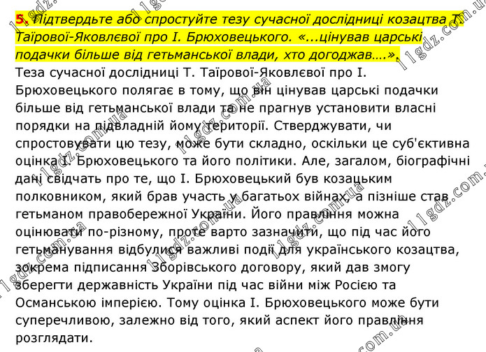 Підтвердьте або спростуйте тезу сучасної дослідниці козацтва Т. Таїрової-Яковлєвої про І. Брюховецького. «...цінував царські подачки більше від гетьманської влади, хто догоджав….». Теза сучасної дослідниці Т. Таїрової-Яковлєвої про І. Брюховецького полягає в тому, що він цінував царські подачки більше від гетьманської влади та не прагнув установити власні порядки на підвладній йому території. Стверджувати, чи спростовувати цю тезу, може бути складно, оскільки це суб'єктивна оцінка І. Брюховецького та його політики. Але, загалом, біографічні дані свідчать про те, що І. Брюховецький був козацьким полковником, який брав участь у багатьох війнах, а пізніше став гетьманом правобережної України. Його правління можна оцінювати по-різному, проте варто зазначити, що під час його гетьманування відбулися важливі події для українського козацтва, зокрема підписання Зборівського договору, який дав змогу зберегти державність України під час війни між Росією та Османською імперією. Тому оцінка І. Брюховецького може бути суперечливою, залежно від того, який аспект його правління розглядати.