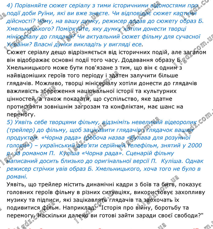 4) Порівняйте сюжет серіалу з тими історичними відомостями про події доби Руїни, які ви вже знаєте. Чи відповідає сюжет картини дійсності? Чому, на вашу думку, режисер додав до сюжету образ Б. Хмельницького? Поміркуйте, яку думку хотіли донести творці мінісеріалу до глядача? Чи актуальний сюжет фільму для сучасної України? Власні думки викладіть у вигляді есе. Сюжет серіалу дещо відрізняється від історичних подій, але загалом він відображає основні події того часу. Додавання образу Б. Хмельницького може бути пов'язане з тим, що він є одним з найвідоміших героїв того періоду і здатен залучити більше глядачів. Можливо, творці мінісеріалу хотіли донести до глядачів важливість збереження національної історії та культурних цінностей, а також показати, що суспільство, яке здатне протистояти зовнішнім загрозам та конфліктам, має шанс на перемогу. 5) Уявіть себе творцями фільму, відзніміть невеликий відеоролик (трейлер) до фільму, щоб зацікавити глядачів і глядачок вашим продуктом. «Чорна рада» (робоча назва «Булава для розумної голови») – український дев’яти серійний телефільм, знятий у 2000 р. за романом П. Куліша «Чорна рада». Сценарій фільму написаний досить близько до оригінальної версії П. Куліша. Однак режисер стрічки увів образ Б. Хмельницького, хоча того не було в романі. Уявіть, що трейлер містить динамічні кадри з боїв та битв, показує головних героїв фільму в різних ситуаціях, використовує захопливу музику та підписи, які зацікавлять глядачів та заохочать їх подивитися фільм. Наприклад: "Історія про війну, боротьбу та перемогу. Наскільки далеко ви готові зайти заради своєї свободи?"