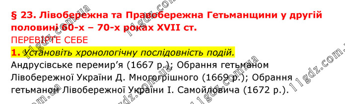 § 23. Лівобережна та Правобережна Гетьманщини у другій половині 60-х – 70-х роках XVII ст. ПЕРЕВІРТЕ СЕБЕ 1. Установіть хронологічну послідовність подій. Андрусівське перемир’я (1667 р.); Обрання гетьманом Лівобережної України Д. Многогрішного (1669 р.); Обрання гетьманом Лівобережної України I. Самойловича (1672 р.).