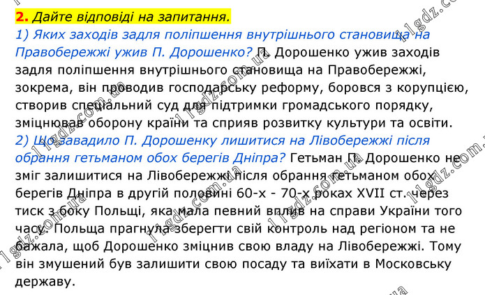 Дайте відповіді на запитання. 1) Яких заходів задля поліпшення внутрішнього становища на Правобережжі ужив П. Дорошенко? П. Дорошенко ужив заходів задля поліпшення внутрішнього становища на Правобережжі, зокрема, він проводив господарську реформу, боровся з корупцією, створив спеціальний суд для підтримки громадського порядку, зміцнював оборону країни та сприяв розвитку культури та освіти. 2) Що завадило П. Дорошенку лишитися на Лівобережжі після обрання гетьманом обох берегів Дніпра? Гетьман П. Дорошенко не зміг залишитися на Лівобережжі після обрання гетьманом обох берегів Дніпра в другій половині 60-х - 70-х роках XVII ст. через тиск з боку Польщі, яка мала певний вплив на справи України того часу. Польща прагнула зберегти свій контроль над регіоном та не бажала, щоб Дорошенко зміцнив свою владу на Лівобережжі. Тому він змушений був залишити свою посаду та виїхати в Московську державу.