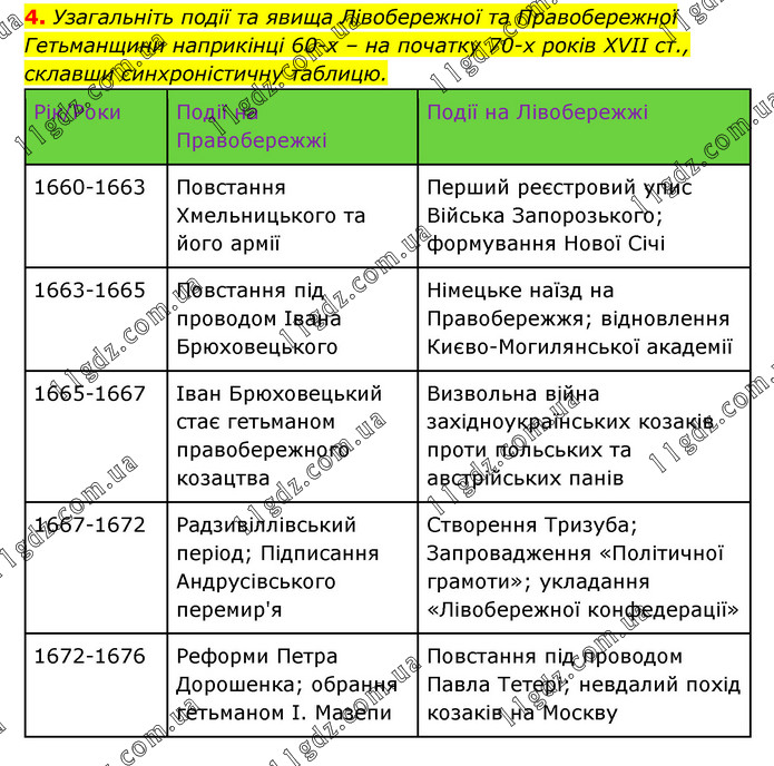 Узагальніть події та явища Лівобережної та Правобережної Гетьманщини наприкінці 60-х – на початку 70-х років XVII ст., склавши синхроністичну таблицю. Рік/Роки Події на Правобережжі Події на Лівобережжі 1660-1663 Повстання Хмельницького та його армії Перший реєстровий упис Війська Запорозького; формування Нової Січі 1663-1665 Повстання під проводом Івана Брюховецького Німецьке наїзд на Правобережжя; відновлення Києво-Могилянської академії 1665-1667 Іван Брюховецький стає гетьманом правобережного козацтва Визвольна війна західноукраїнських козаків проти польських та австрійських панів 1667-1672 Радзивіллівський період; Підписання Андрусівського перемир'я Створення Тризуба; Запровадження «Політичної грамоти»; укладання «Лівобережної конфедерації» 1672-1676 Реформи Петра Дорошенка; обрання гетьманом І. Мазепи Повстання під проводом Павла Тетері; невдалий похід козаків на Москву