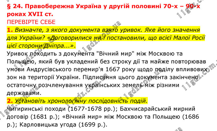 § 24. Правобережна Україна у другій половині 70-х – 90-х роках XVII ст. ПЕРЕВІРТЕ СЕБЕ 1. Визначте, з якого документа взято уривок. Яке його значення для України? «Договорилися ми і постановили, що всієї Малої Росії цієї сторони Дніпра...». Уривок походить з документа "Вічний мир" між Москвою та Польщею, який був укладений без строку дії та майже повторював умови Андрусівського перемир'я 1667 року щодо поділу впливових зон на території України. Підписання цього документа закінчено остаточну розчленування українських земель між різними державами. 2. Установіть хронологічну послідовність подій. Чигиринські походи (1677-1678 рр.); Бахчисарайський мирний договір (1681 р.); «Вічний мир» між Москвою та Польщею (1686 р.); Карловицька угода (1699 р.).