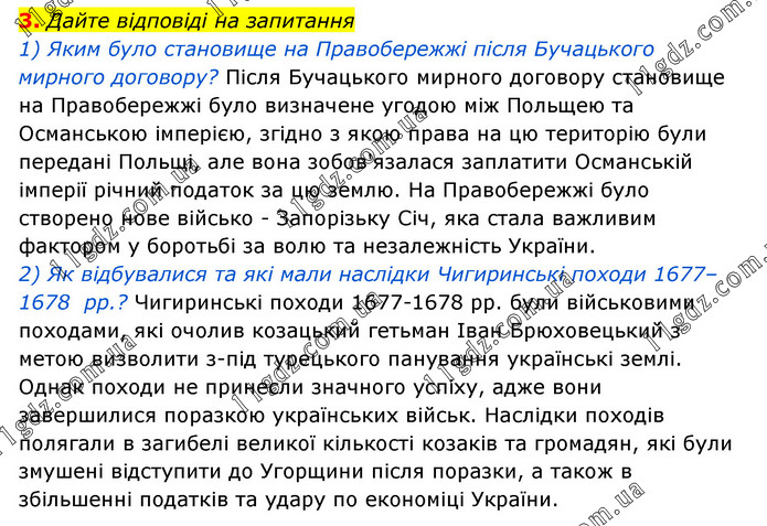 Дайте відповіді на запитання 1) Яким було становище на Правобережжі після Бучацького мирного договору? Після Бучацького мирного договору становище на Правобережжі було визначене угодою між Польщею та Османською імперією, згідно з якою права на цю територію були передані Польщі, але вона зобов'язалася заплатити Османській імперії річний податок за цю землю. На Правобережжі було створено нове військо - Запорізьку Січ, яка стала важливим фактором у боротьбі за волю та незалежність України. 2) Як відбувалися та які мали наслідки Чигиринські походи 1677–1678 рр.? Чигиринські походи 1677-1678 рр. були військовими походами, які очолив козацький гетьман Іван Брюховецький з метою визволити з-під турецького панування українські землі. Однак походи не принесли значного успіху, адже вони завершилися поразкою українських військ. Наслідки походів полягали в загибелі великої кількості козаків та громадян, які були змушені відступити до Угорщини після поразки, а також в збільшенні податків та удару по економіці України.